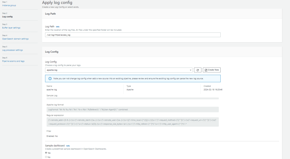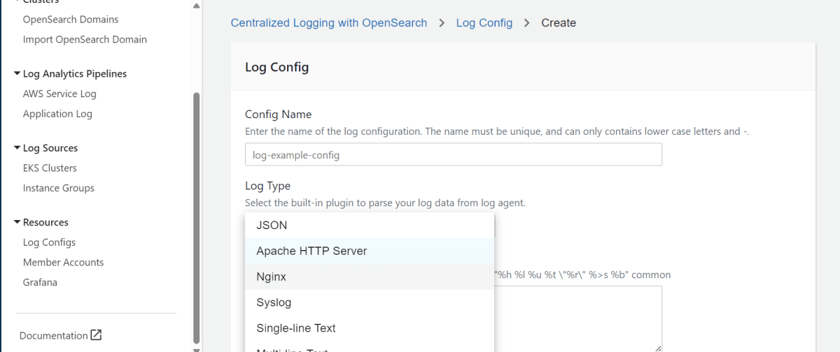 またEC2のログをOpenSearchに転送する際、どのようにパースするのか定義するLog Configの設定も必要になります。