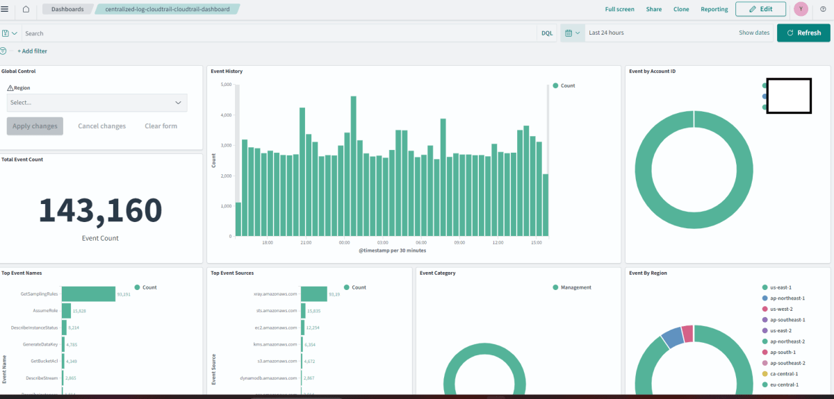 Globalテナントであることを確認したら左サイドバーからOpenSearch Dashboards > DashboardsでCloudTrailログ用のダッシュボードを確認します。