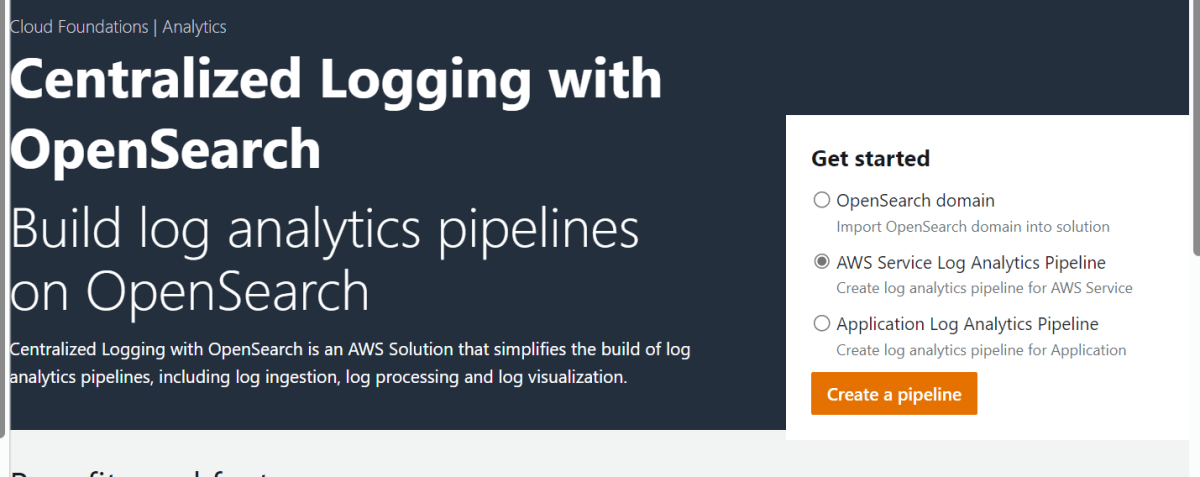 このソリューションライブラリには対象となるAWSサービスログの選定やアプリケーションログをOpenSearchへ取り込むためのパイプラインを簡単に作成してくれるWebベースのコンソール画面が提供されています。
