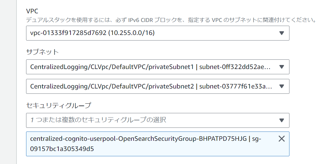 CloudFormationで新規VPCの作成したら対応するサブネットとセキュリティグループも一緒に作られており、サブネットはプライベートサブネット、セキュリティグループはOpenSearchSecurityGroupと名付けられているものを選択します。