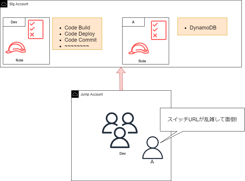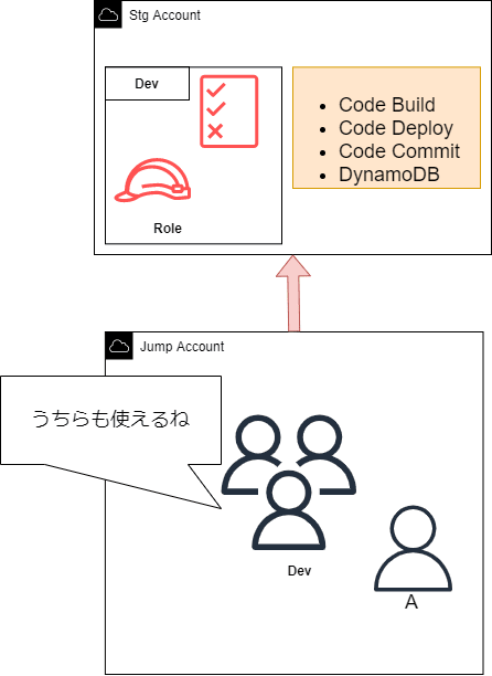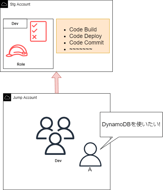 もしこの時AにDynamoDBのアクセス権限を渡すとなると、Devチーム全体のIAM RoleにDynamoDBの権限を与える必要が出てきます。