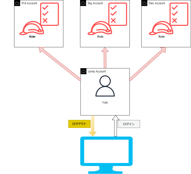 ジャンプアカウントにIAMユーザーを登録し、それぞれのアカウントにはIAMロールを作成します。