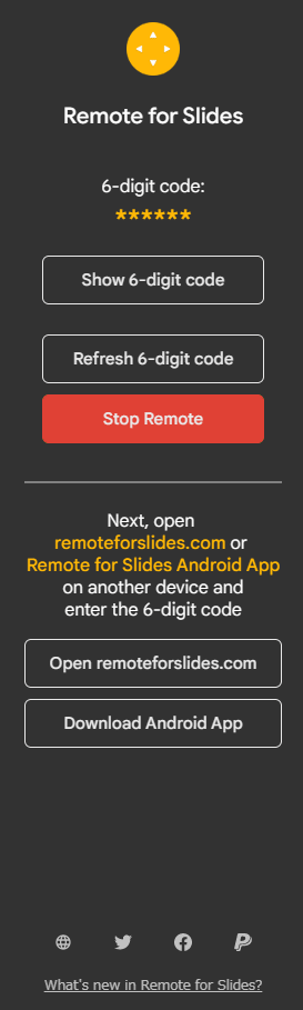 こちらをクリックしますとRemote for Slidesサイドバーが表示されたプレゼンテーションモードに移行し、Start Remoteボタンをクリックしますとスマホ側で入力するための6桁のパスコードが表示されます。
