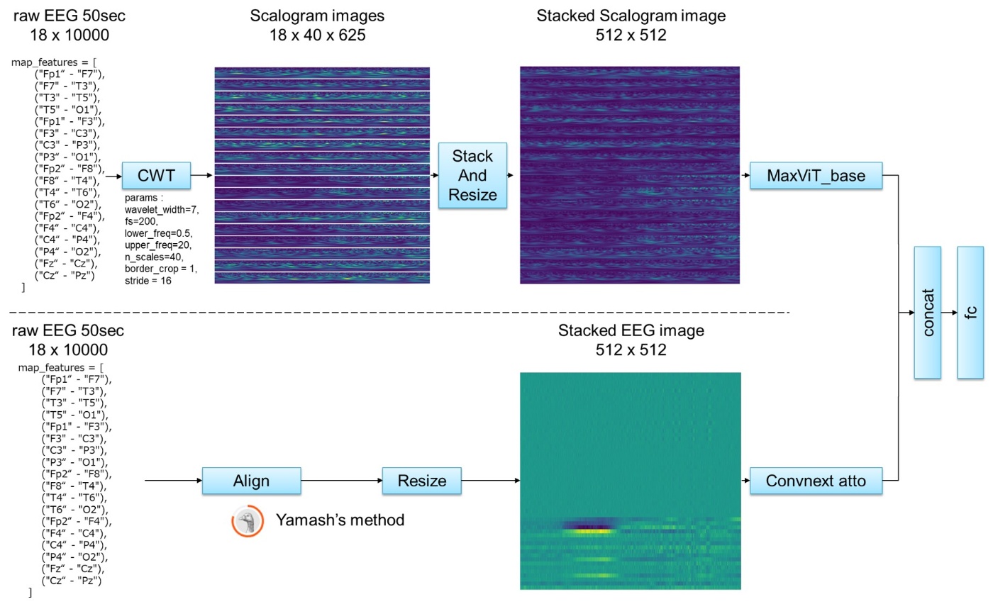 EEGから生成した16チャネルの前後方向のモンタージュ(合成画像)に基づいて2種類の画像表現を取得し、timmによる2DCNNに入力します。