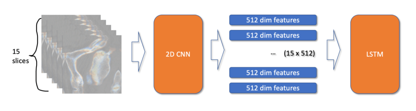 2DCNN extract 512 dim features from each 15 slice, and LSTM learn the features CNN outputted. So that the whole model can learn the features of the whole vertebrae.