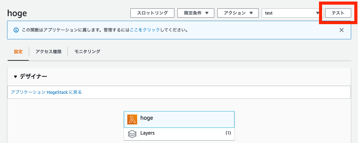 無事上記のデプロイが完了していたら Lambda > 関数のページを見てみると hoge という名前の関数があるはずなのでそれをクリックして画面右上のテストボタンを押してみましょう!