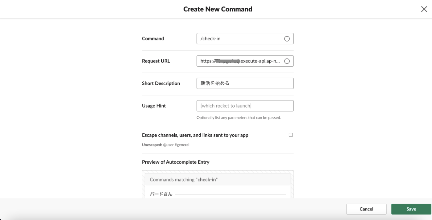 「Command」に作成したいスラッシュコマンドを「Request URL」に POST 先の URL を指定します。「Short Description」にはスラッシュコマンドの概要を記載します。