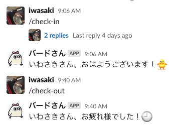 バードさん(今回作った Slack アプリ)の場合はこんな感じです。