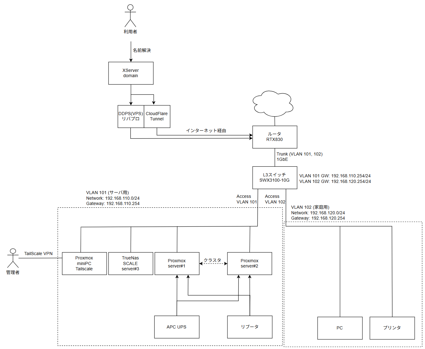 管理者はTailscaleを経由してVLAN101へ直接アクセスでき、自宅外からでもSSH接続が可能です。もちろんスマホからでも各VMの操作も可能です。