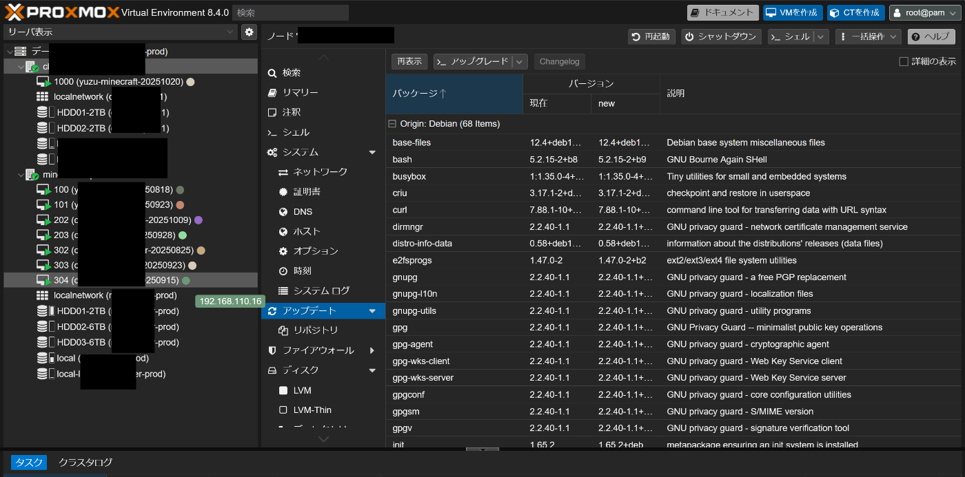 仮想化環境には Proxmox VE 8.4 を採用し、複数のVM(仮想マシン)を運用しています。