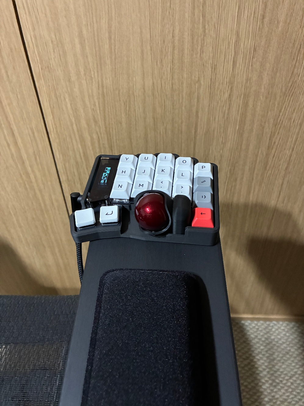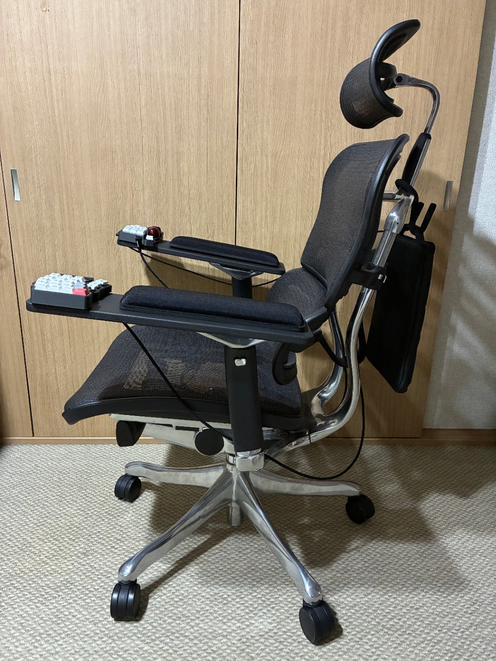 分割式キーボードを置くスペースを確保するために椅子のアームレストを延長する必要があります。