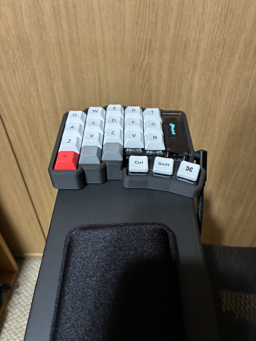 ちなみに、アームレストの先端にマウスを置けるようにしたいという要望が結構あるようで、そのための既製品もたくさんありました。Amazonで「アームレスト マウスパッド」で検索するとたくさん出てきますので、これを使って分割式キーボードを置くスペースを確保するのもありだと思います。