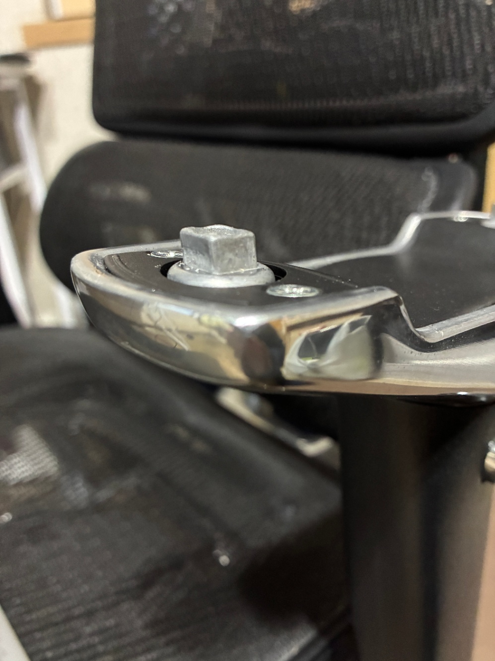 ただちょっと苦労したのはエルゴヒューマンのアームレストを外すと下記のようにネジ穴が凸状になっており、単純に木材に穴あけしただけではうまくくっつけられませんでした。
