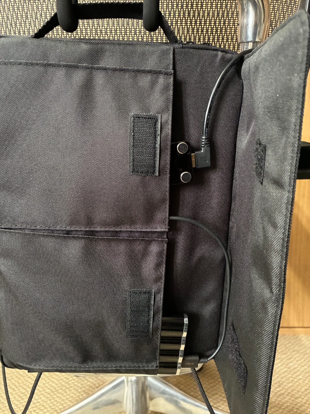 背面のバックパックには有線式キーボードを無線化するためのデバイスとモバイルバッテリーが入っています。