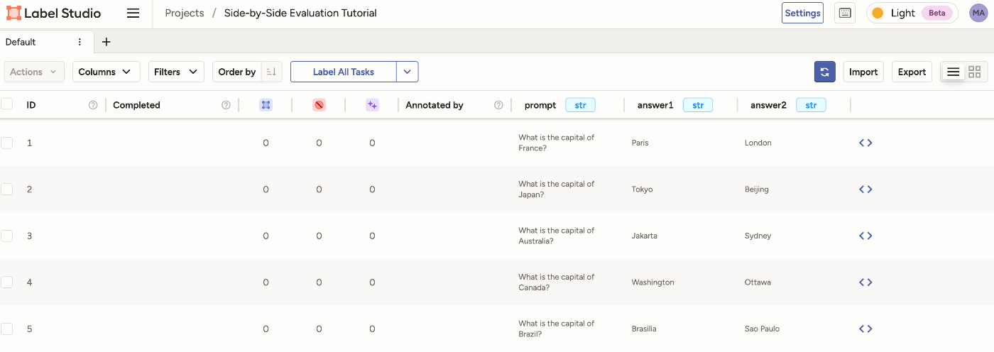 「Label All Tasks」での実際のSide-by-Side評価アノテーション画面は以下の通りです。