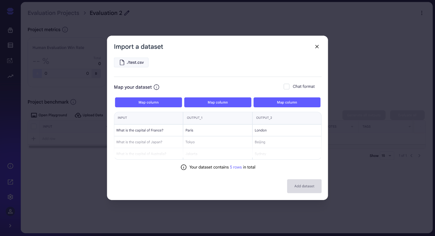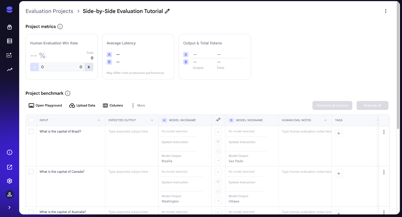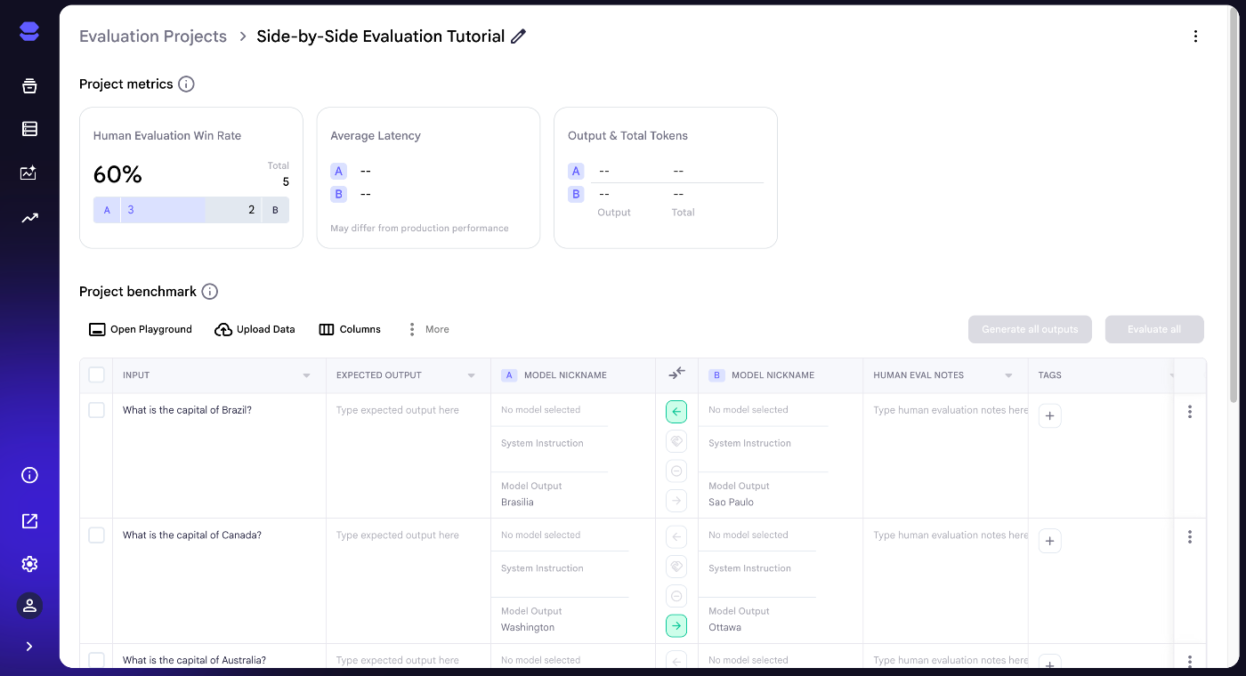 同じデータセット上で2つの異なるモデルまたはシステムプロンプトを直接比較するために使用。