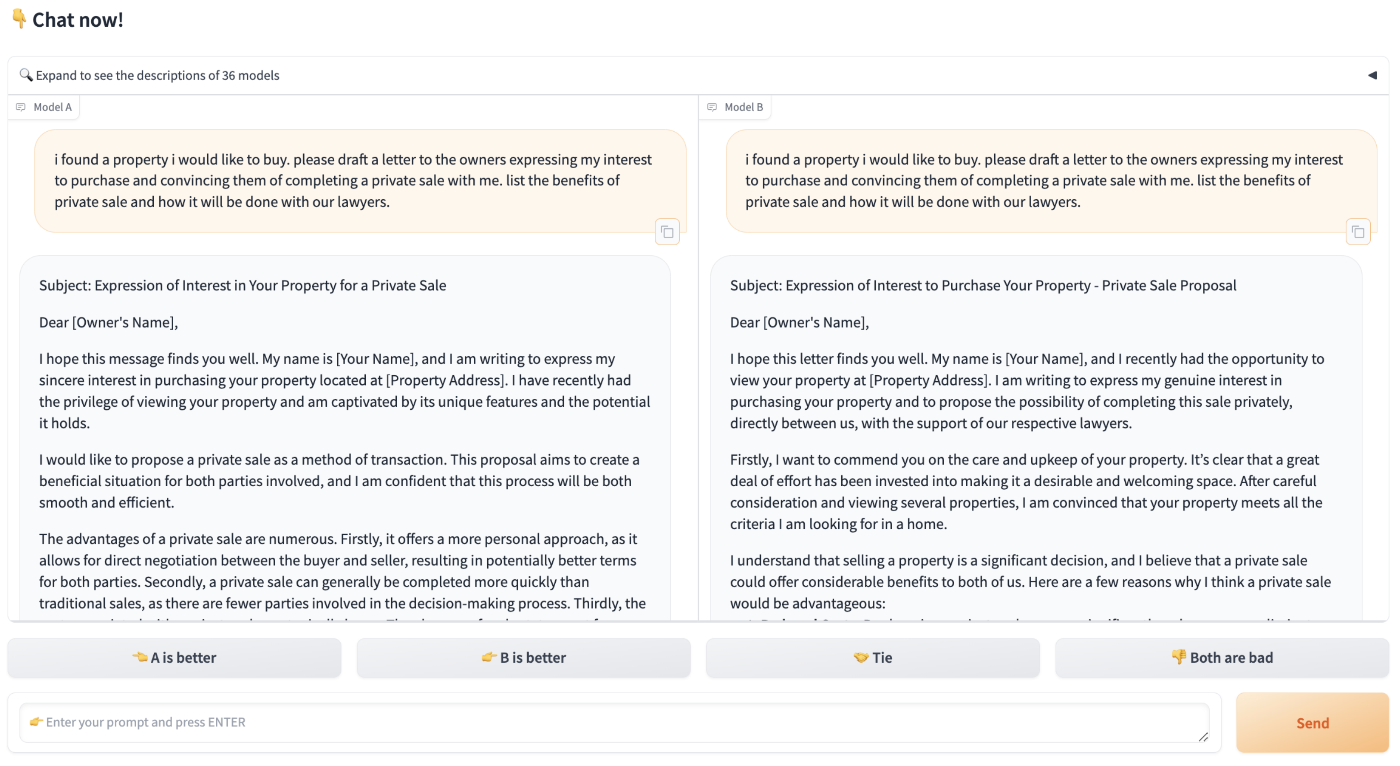 この問題に対処するため、Chatbot Arenaでは、ユーザーに2つのモデルの応答を比較させ、より良い方を選ぶというSide-by-Side比較メカニズムを採用しています。