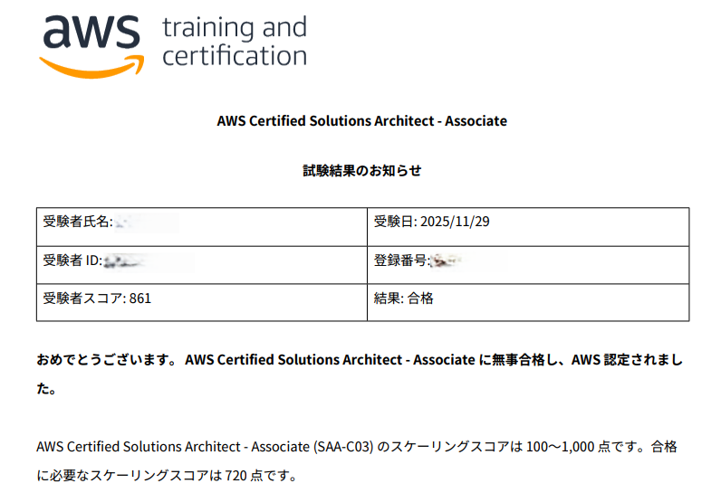 試験終了後は合否が発表されず、後ほどAWSのマイページ?に結果が掲載されます。