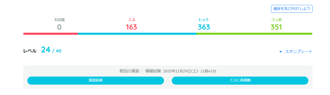 下記が実績となっていて、間違った問題が「ミス」、正解を「ヒット」、連続正解を「コンボ」としてカウントしてくれます。