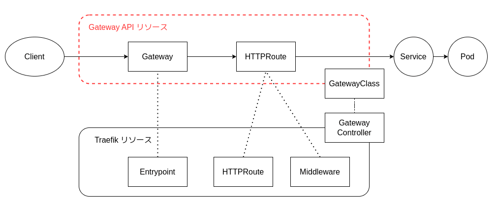 を指定しているので CRD を元に traefik のリソースが自動で構成されましたが、他の gatewayClass を指定すればそちらの gateway controller を元にリソースが管理されます。ingressClass や storageClass のように複数の gatewayClass が存在する際に指定した class に基づいて実装や管理を分けられる点が Gateway API を使うメリットの一つとなっています。