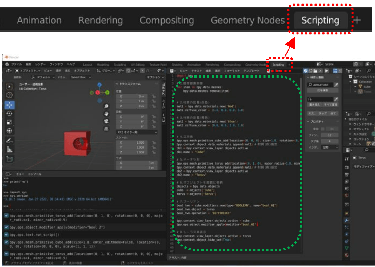 Blenderの Scripting をクリックするとPythonスクリプトを記載する領域(図の緑破線)が表示されます。