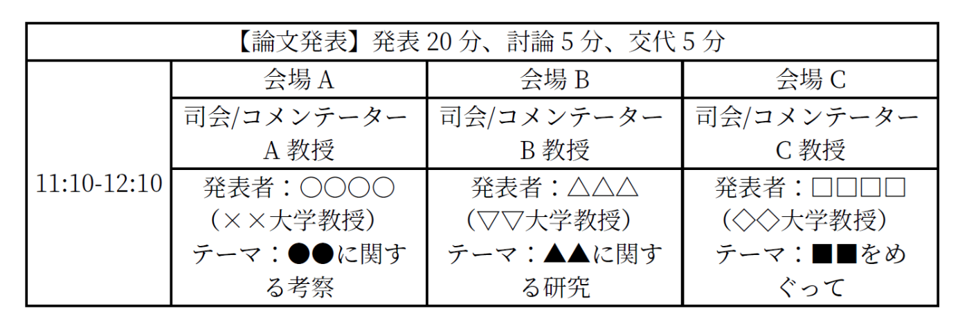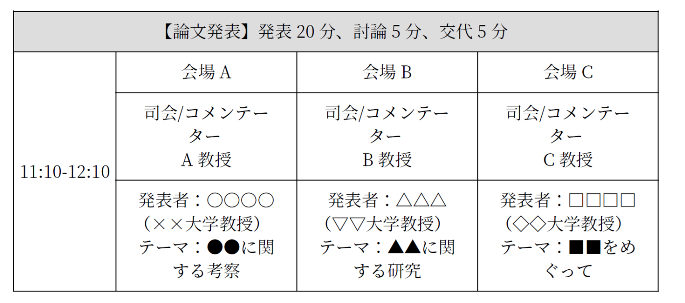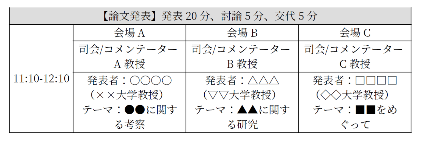 table.cell(colspan: 4)[【論文発表】発表20分、討論5分、交代5分], //セルを横に結合