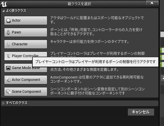 - BluePrintクラスをPlayerControllerを親クラスに指定して作成(MyPlayerControllerクラス)