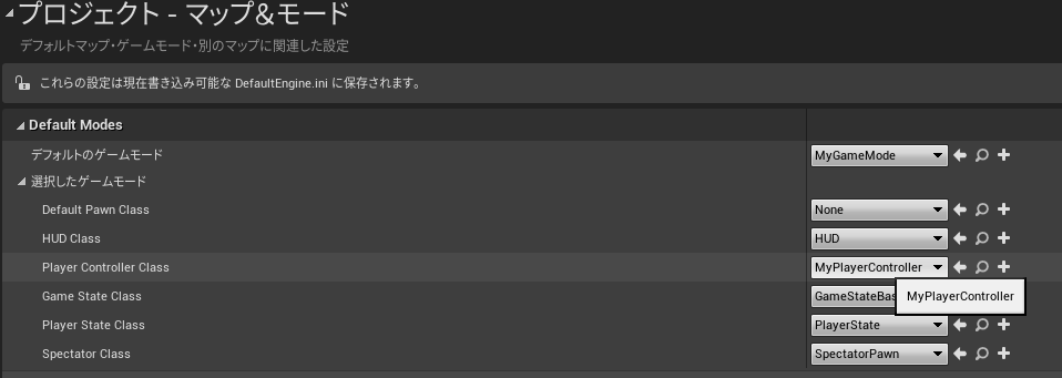 - プロジェクト設定を開きマップ&モードの設定にあるPlayerControllerClassを作成したMyPlayerControllerクラスを指定