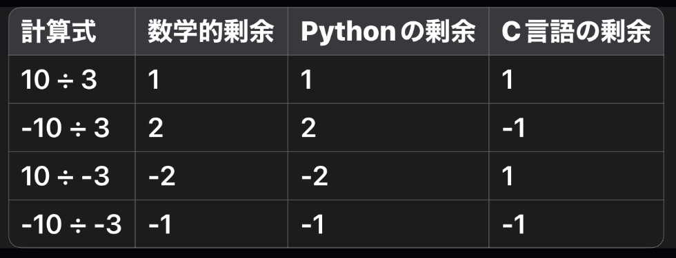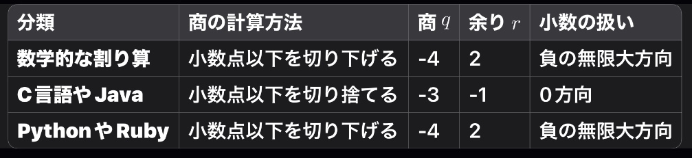 - PythonやRubyは数学的な整合性を重視し、余りを「除数と同じ符号」に調整する。