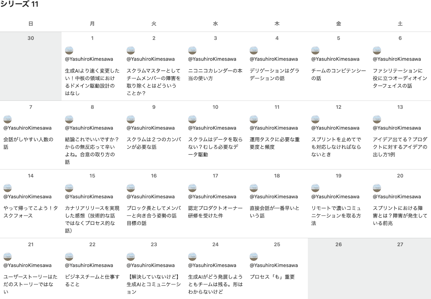 さらに、今年はこの「ひとりアドカレ」を追従する方が現れ、シリーズ 11 は@YasuhiroKimesawa さんによる、スクラム関連記事に特化したカレンダーとなっています。@YasuhiroKimesawa さんは認定スクラムマスターを取得していて ZOZO 社内でもスクラムに一家言ある存在です。特にスクラム系の記事に目を通している方にとって、有意義なカレンダーになるのではないでしょうか。